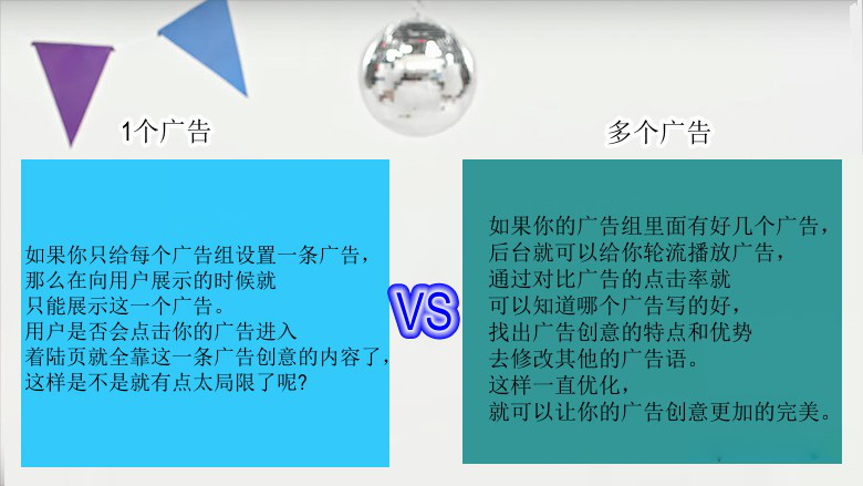 根據我們運營(yíng)賬戶(hù)的數據顯示,在點(diǎn)擊次數上,設置3條以上廣告的廣告組要高出設置一個(gè)廣告的廣告組的30%-40%。難道你忍心白白浪費掉這30%-40%的流量嗎?損失掉的這些點(diǎn)擊次數同時(shí)也會(huì )讓你在同行中失去競爭力,減少轉化次數。