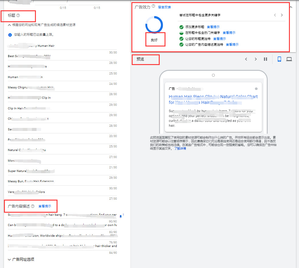 所以,我們在運營(yíng)賬戶(hù)的時(shí)候要給每個(gè)廣告組添加至少3個(gè)廣告創(chuàng )意,其中加大型文字廣告≥2條,自適應搜索廣告≥1條。